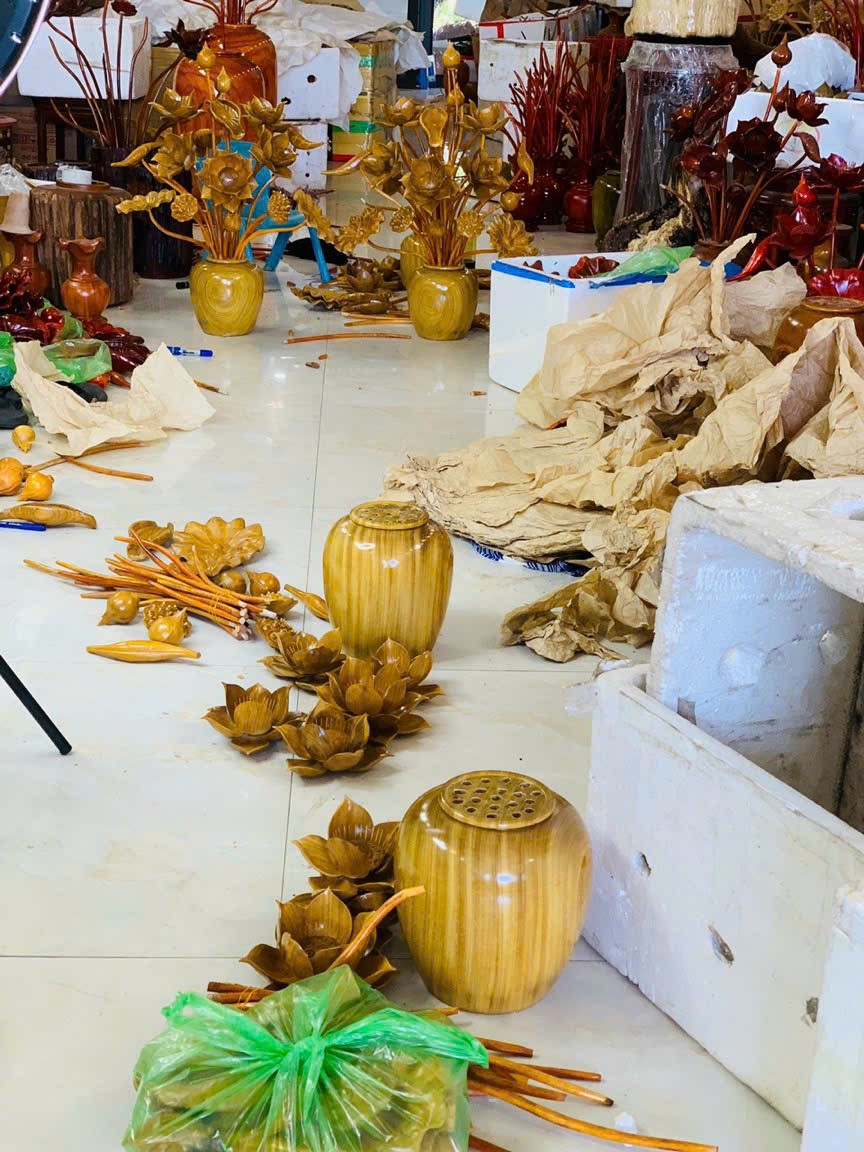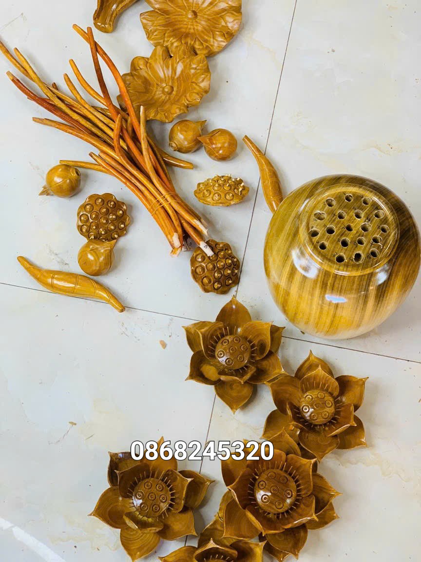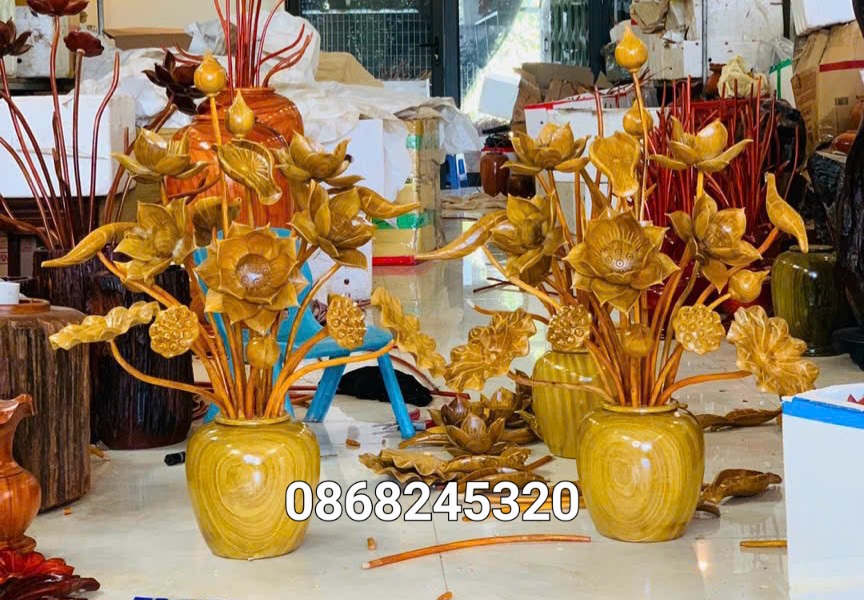 _ 1 bình hoa sen 19 bông được làm bằng chất liệu gổ cẩm vàng tự nhiên 100%