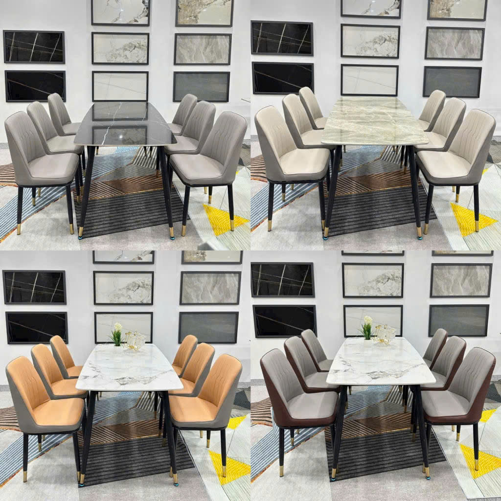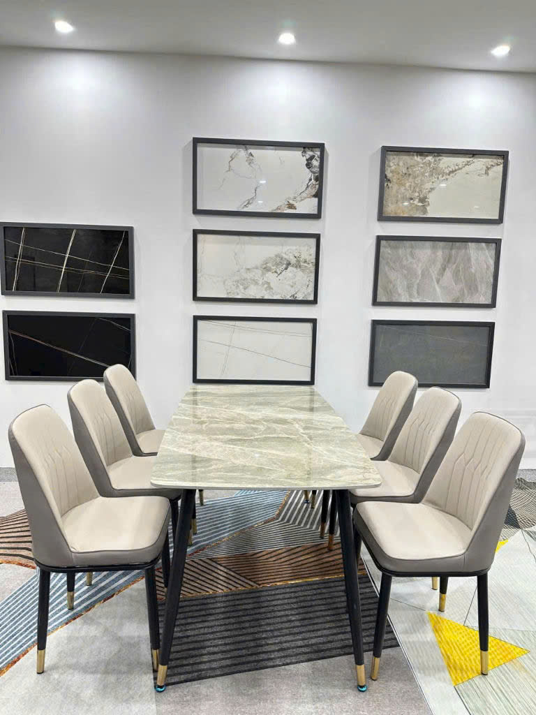 Chất liệu: Mặt đá Ceramic, chân sắt sơn tĩnh điện , đế thép sơn tĩnh điện, Inox tráng bạc, khung inox mạ vàng 201, có viền da bao quanh, đế thép sơn tĩnh điện ...