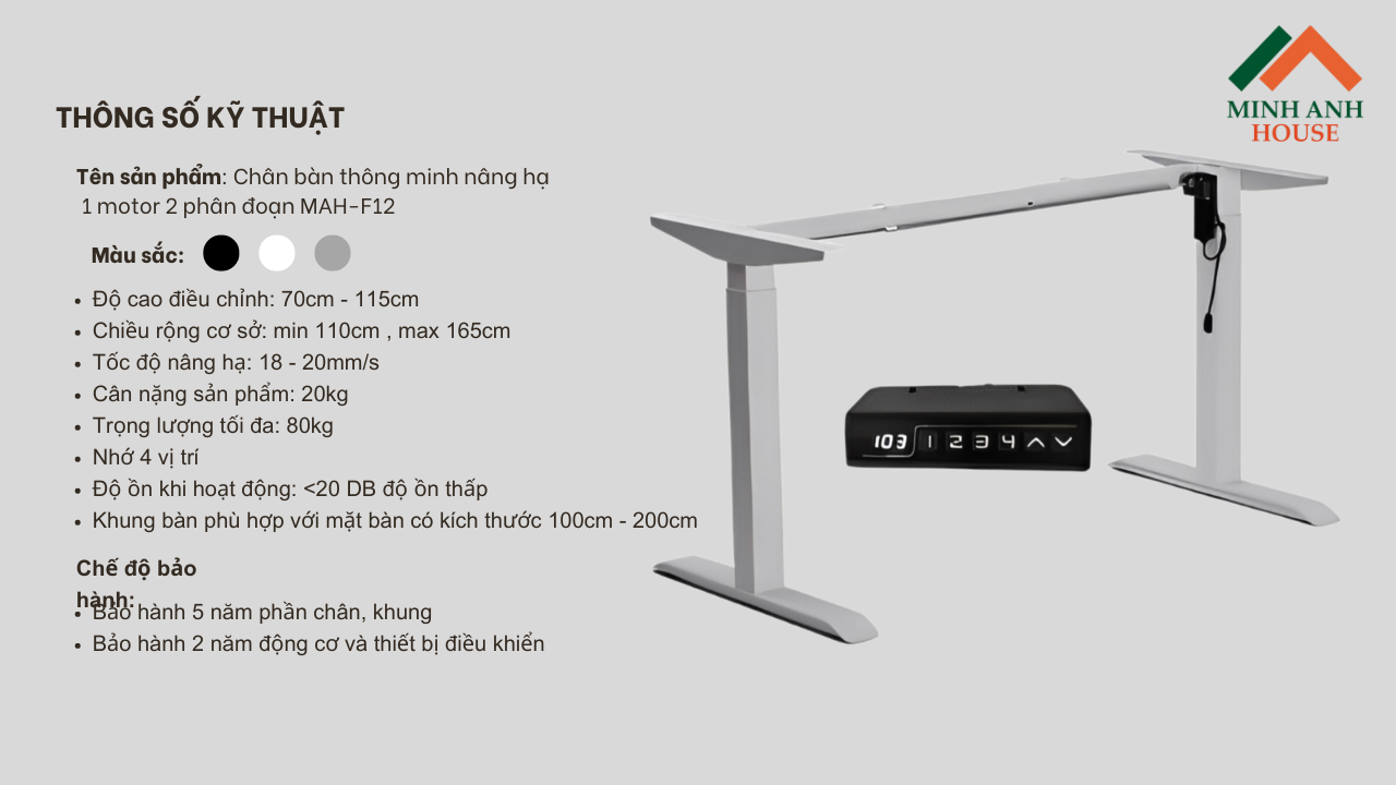 - Bảo hành 05 năm cho tất cả các thành phần khung chân , 02 năm động cơ và các thiết bị điều khiển.