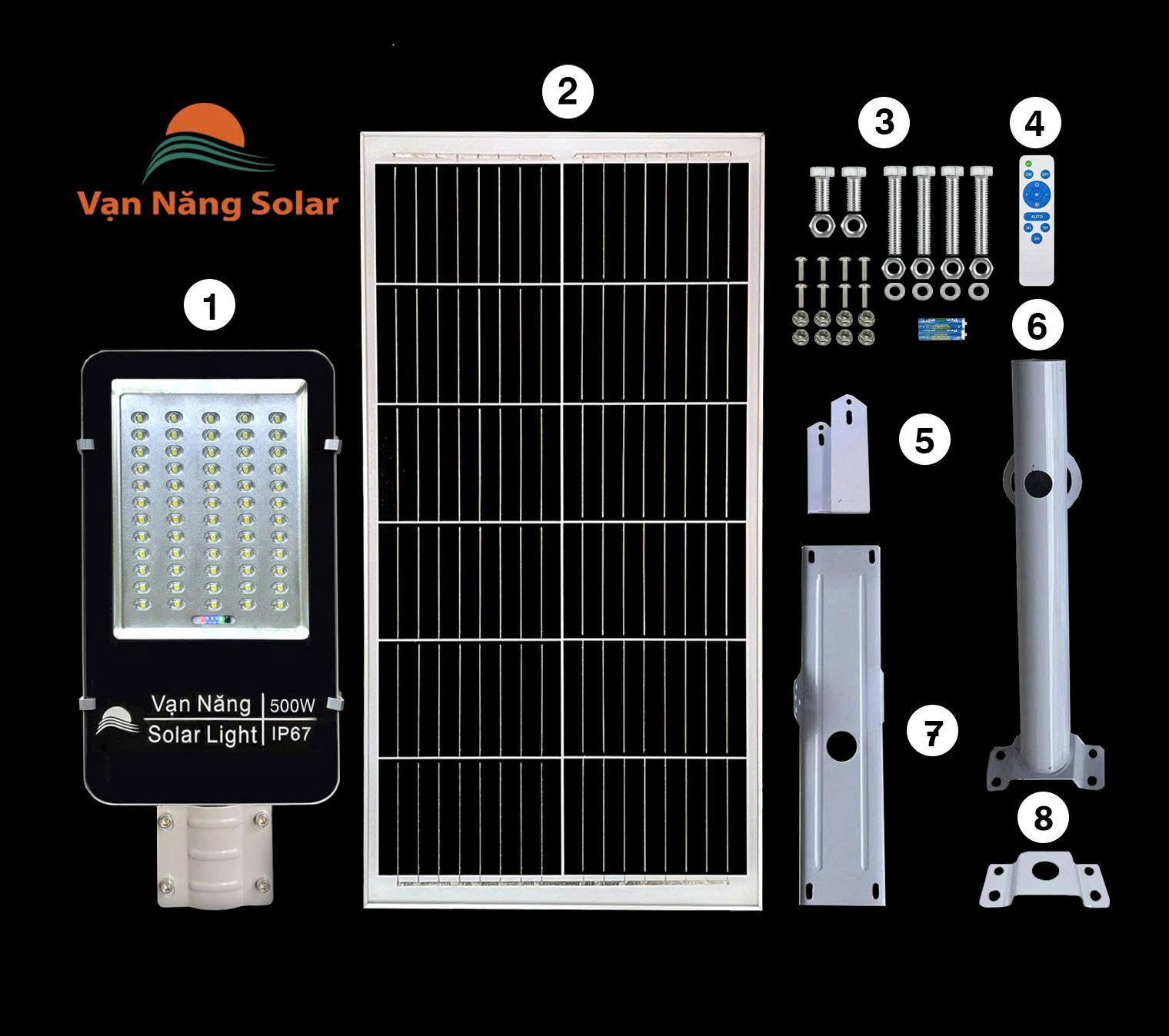 Bộ sản phẩm gồm Đèn + Tấm pin solar + Cần Đèn + Remote + Và 1 sô phụ khiện ốc vít đi kèm giấy HDSD và phiếu bảo hành