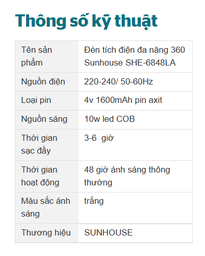 Giới thiệu Đèn Tích Điện Đa Năng 360 Cỡ Trung Sunhouse SHE-6848LA - Trắng