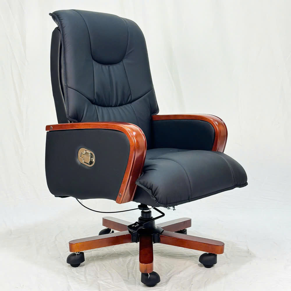 | Chất liệu | Ghế nệm dày bọc da thật phần tiếp xúc, chân ghế thép ốp gỗ. Ghế ngả lưng nghỉ trưa, điều chỉnh xoay nâng hạ độ cao |
