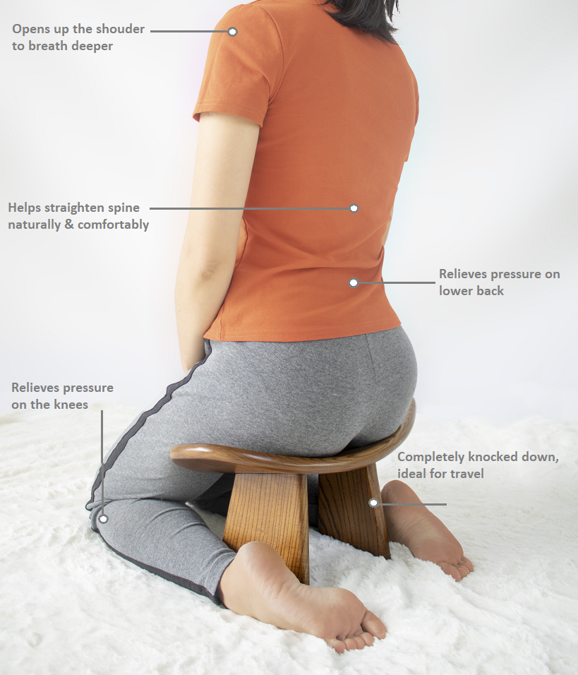 Trong thực hành thiền, thực hiện đúng cách sẽ mang lại cho bạn nhiều lợi ích sức khỏe về cả tinh thần lẫn thể chất. Ghế này sẽ giúp bạn duy trì tư thế, tập trung và thư giãn. Bằng cách duỗi chân của bạn bên dưới ghế và ngồi thẳng lưng, với thiết kế đặc biệt, chiếc ghế sẽ giúp ngăn ngừa mỏi và tê chân, giảm đau lưng và cổ, loại bỏ căng thẳng và giúp bạn đi vào trạng thái thiền định rất sâu mà không cần thay đổi tư thế.