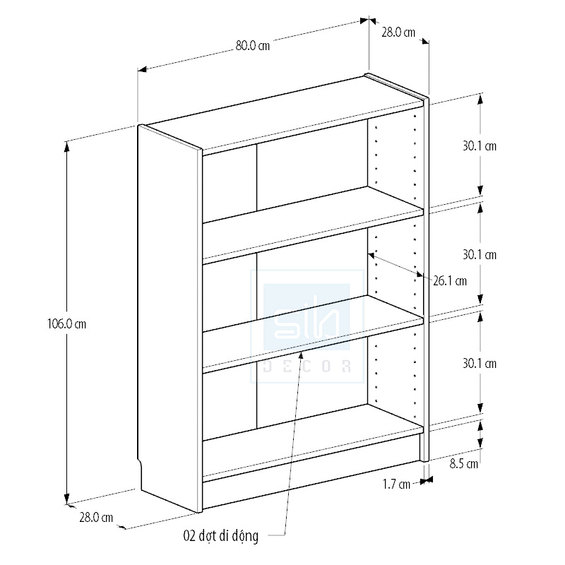 - Với chiều sâu đến 28cm có khả năng để được rất nhiều sách, đồ trang trí, phía sau có tấm hậu giúp đảm bảo an toàn cho vật dụng, sách vở,...