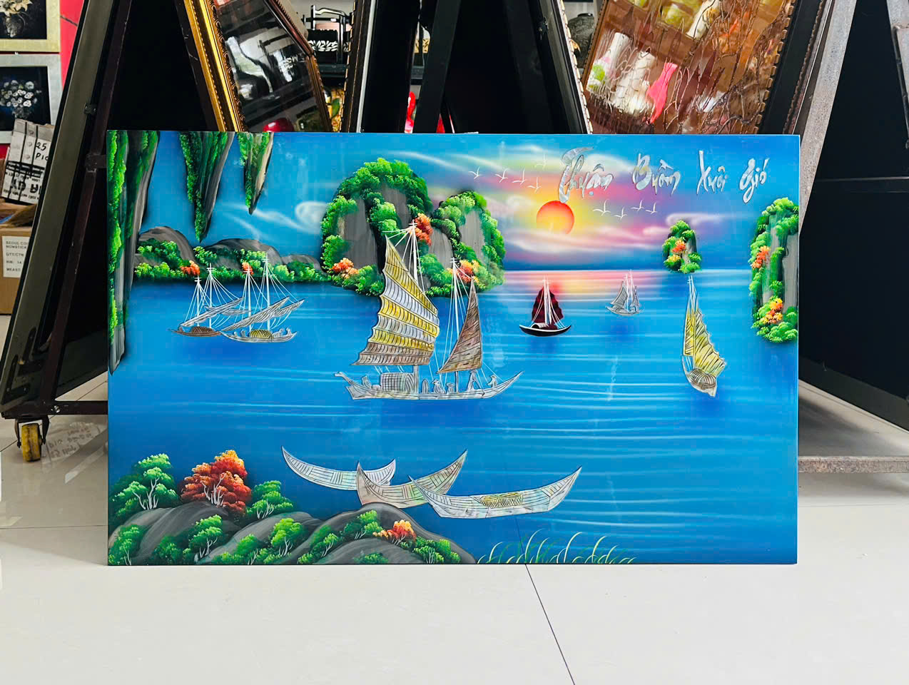 Ngoài ra, điểm nhấn chính của bức tranh là những con thuyền buồm được khảm xà cừ có ánh màu ngũ sắc rất sang trọng và tự nhiên. Đây là loại tranh cao cấp hàng đầu của các loại tranh sơn mài vì độ tinh xảo cũng như nguyên liệu tạo hình đặc thù và độc đáo. Xà cừ là một loại ốc biển, vỏ có vân ngũ sắc khi được mài bóng sẽ thể hiện sự huyền ảo của bực tranh, đặc biệt là các bức tranh phong thủy.