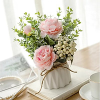 Hoa lụa, chậu hoa mẫu đơn điểm quả thảo để bàn trang trí quán cà phê, bàn làm việc sang trọng, lọ hoa decor phòng khách đẹp