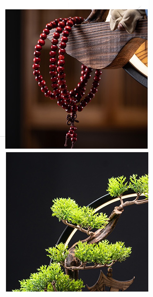 Thiết kế: Vòng tròn kim loại, đế gỗ, cây tùng xanh tài lộc