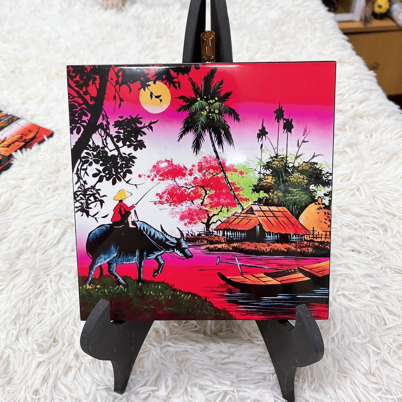 Tất cả tranh sơn mài được sử dụng màu vẽ, sơn PU với chất lượng tốt giúp tranh luôn giữ được màu vẽ, độ bóng bền vững theo thời gian. Đồng quê Việt Nam luôn là nguồn cảm hứng bất tận của những người nghệ sĩ yêu quê hương. Những cánh đồng lúa bạt ngàn, những con người lao động chân chất nhưng cần cù chịu thương chịu khó là những nét đẹp của đất nước trong mắt nhân dân và bạn bè quốc tế. Các bức tranh phong cảnh làng quê Việt Nam với những hình ảnh quen thuộc như gốc đa giếng nước, cậu bé chăn trâu thổi sáo,…Những hình ảnh của làng quê vừa mộc mạc, giản dị lại vừa thể hiện vẻ đẹp thơ mộng, yên bình của làng quê Việt Nam. Những hình ảnh từ tranh làng quê này gợi nhớ cho chúng ta nỗi nhớ nhung mam mác về sự yên bình không thể phai nhòa trong tâm thức mỗi người dân Việt. Xã hội ngày càng hiện đại, những hình ảnh quen thuộc của phong cảnh làng quê Việt Nam dần được thay thể bởi những khu công nghiệp với những nhà máy, máy móc hiện đại,…khiến bạn không được ngắm những hình ảnh đẹp của quê hương thân thương ngày xưa nữa. Chính vì thế, bằng những nét vẽ tinh tế, các họa sĩ đã sáng tạo nên những bức tranh phong cảnh làng quê Việt Nam để giúp bạn có thể lại được thấy những hình ảnh thân thuộc của tuổi thơ.