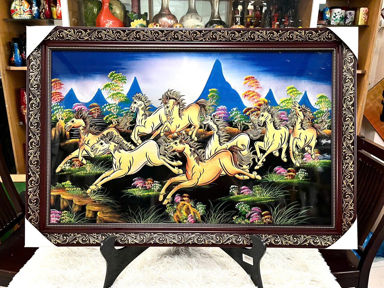 Tranh sơn mài mã đáo thành công thể hiện sự sắc xảo đến từng chi tiết của các nghệ nhân sơn mài qua sự sung mãn của những chú ngựa mạnh mẽ mang đến sự phát lộc trong làm ăn, thành công trong cuộc sống.