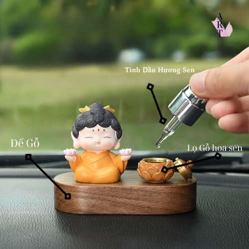 Tượng + Đế gỗ + hoa sen gỗ : Ngang 10cm x rộng 5cm + cao 2cm (kèm tinh dầu hương hoa sen)