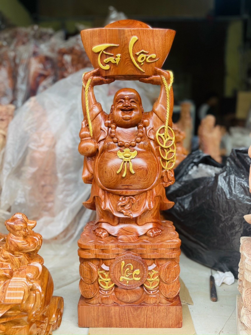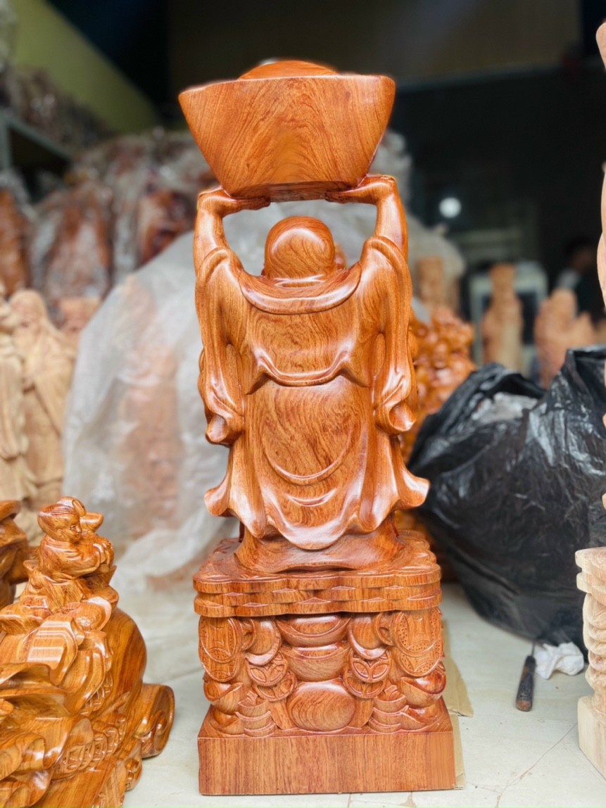 Giới thiệu Tượng phật di lặc dâng tiền vàng bằng gỗ hương đá liền khối cao 70×26×15cm