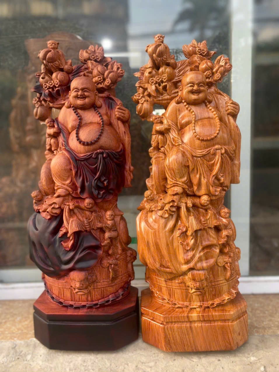 _ Tượng được khắc tỉ mỉ ,tinh xảo kỳ công .Đi hầu hết tất cả mọi chi tiết góc ngách nội dung hoa văn của tượng đều được gọt tỉa chỉnh sửa sắc nét hoàn toàn bằng tay thủ công .Đồng thời tượng được kiểm định kỹ lưỡng khắt khe ,Như cho vào thẩm sấy cho gỗ khô kiệt .Mục đích chống dập nứt vênh mo mối mọt .Kết hợp với trà nhám ,đánh giấy giáp nhiều nước sờ mát lạnh .Song cho vào phun lót làm bóng mờ để giữ lại mầu sắc vân gỗ tự nhiên .Cũng như sơn pu giả cổ đẹp long lanh như ảnh trên .Tượng được làm và hoàn thiện do bàn tay khối óc tài hoa .Từ những người thợ giàu kinh nghiệm cũng như tay nghề cao trong làng nghề truyền thống .